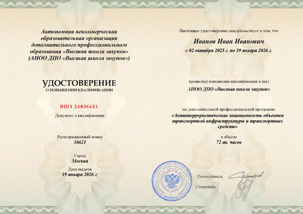 Повышение квалификации, 72 академических часов, 7 модулей: нормативно-правовые основы противодействия терроризму, анализ угроз и рисков, функциональные обязанности ответственных, инженерно-техническая укрепленность, документооборот и действия персонала при ЧС. Онлайн-обучение в в Тамбове с итоговой аттестацией.