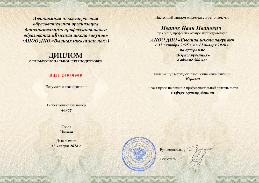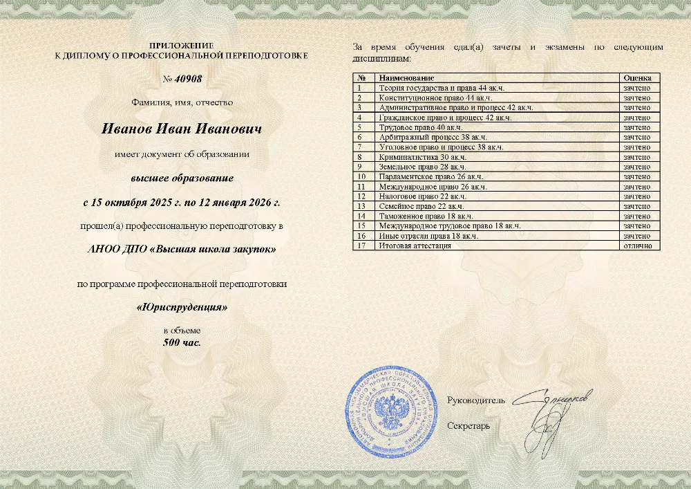 Профессиональная переподготовка, 500 академических часов, 16 модулей: теория государства и права, конституционное, гражданское, уголовное и трудовое право, арбитражный и административный процесс, налоговое, земельное, таможенное и международное право. Онлайн-обучение в в Тамбове с итоговой аттестацией.