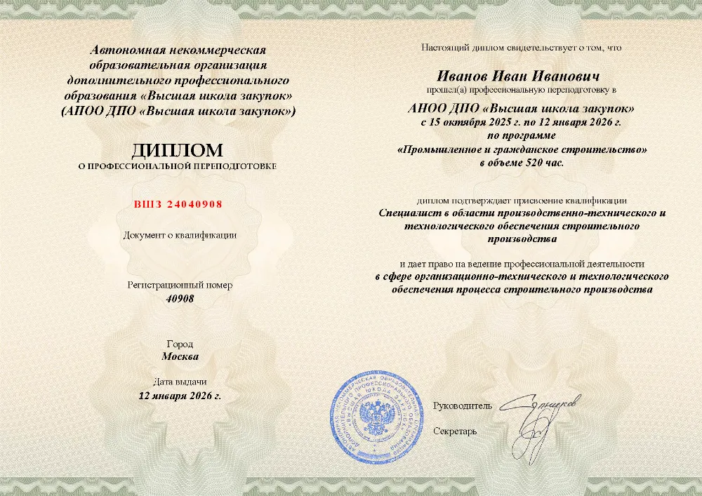 Это полноценная образовательная программа для получения дополнительной квалификации и освоения новой профессии. Для поступления также требуется высшее или среднее профессиональное образование (СПО). Итоговым документом является полноценный диплом о профессиональной переподготовке, который ценится на рынке труда. Программы являются наиболее объемными и начинаются от 250 академических часов, что обеспечивает глубокое погружение в специальность.