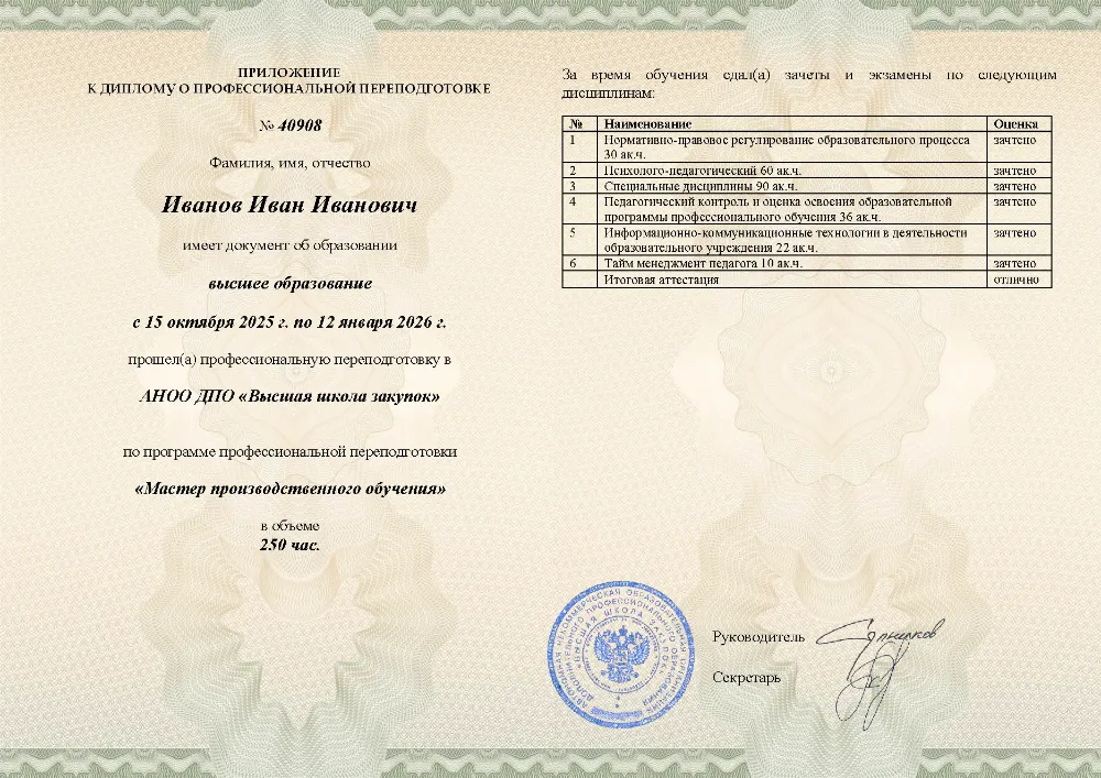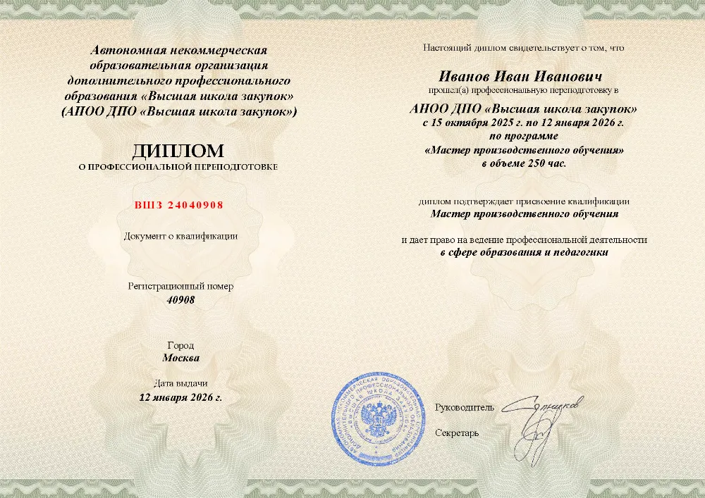 Профессиональная переподготовка, 250 академических часов, 11 модулей: нормативно-правовое обеспечение, основы педагогики и психологии, проектирование образовательных программ, методика профессионального обучения, педагогический контроль, применение ИКТ и тайм-менеджмент педагога. Онлайн-обучение в в Тамбове с итоговой аттестацией.
