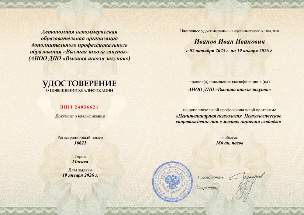Повышение квалификации, 180 академических часов, 8 модулей: основы и структура пенитенциарной системы, социально-психологические особенности и типологии осужденных, средства исправления, работа с несовершеннолетними и деятельность психологической службы в учреждениях УИС. Онлайн-обучение в в Тамбове с итоговой аттестацией.
