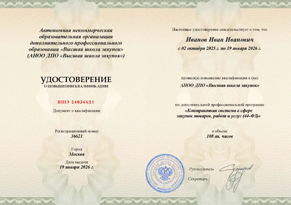 Программа профессиональной переподготовки 250 академических часов для специалистов по закупкам по 44-ФЗ. Курс охватывает полный цикл закупочной деятельности, проходит в дистанционном формате с практической направленностью. По итогам выдается диплом о профессиональной переподготовке с присвоением квалификации.